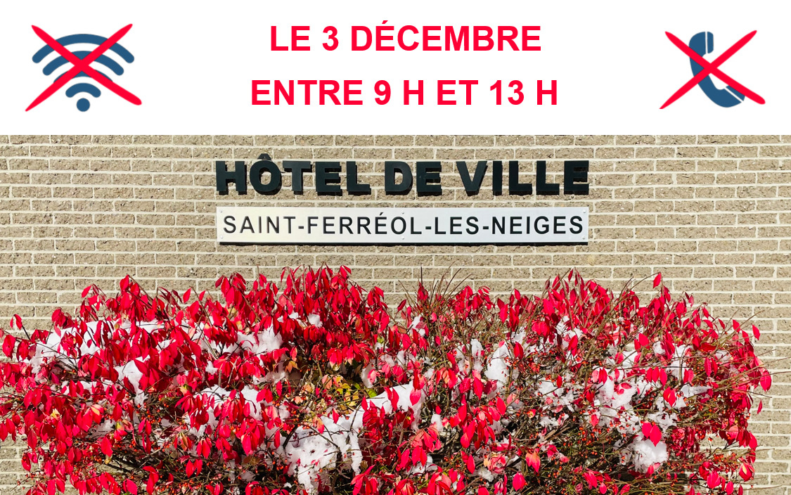 Le mercredi 3 décembre en matinée, en raison de travaux réalisés par Hydro-Québec, l’équipe de l’hôtel de ville n'aura pas accès au téléphone, au réseau informatique et à Internet, entre 9 h et 13 h. Les bureaux ouvriront à la population en après-midi seulement. Merci de votre compréhension.