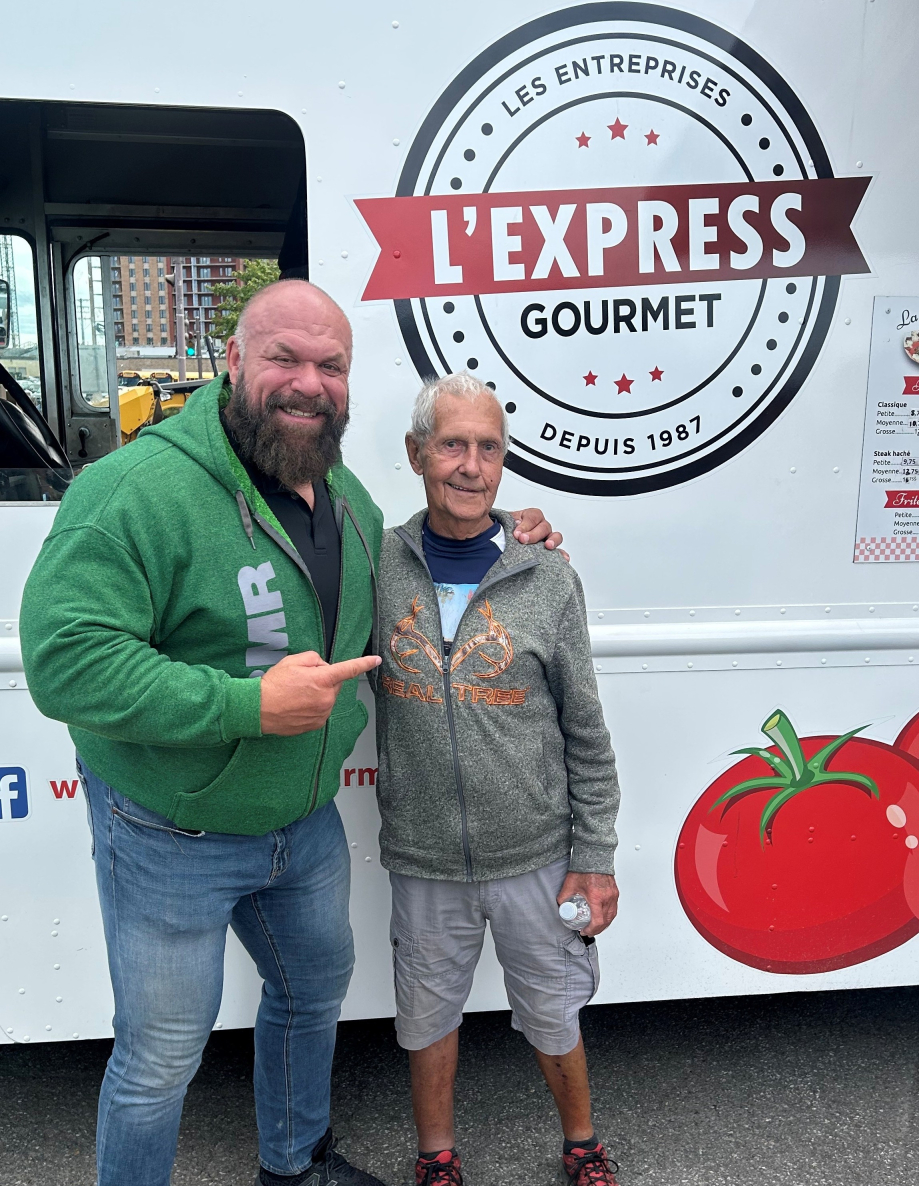 Jacques Daigle en compagnie de son idole, l’homme fort Hugo Girard. (Photo : gracieuseté Mario Daigle)