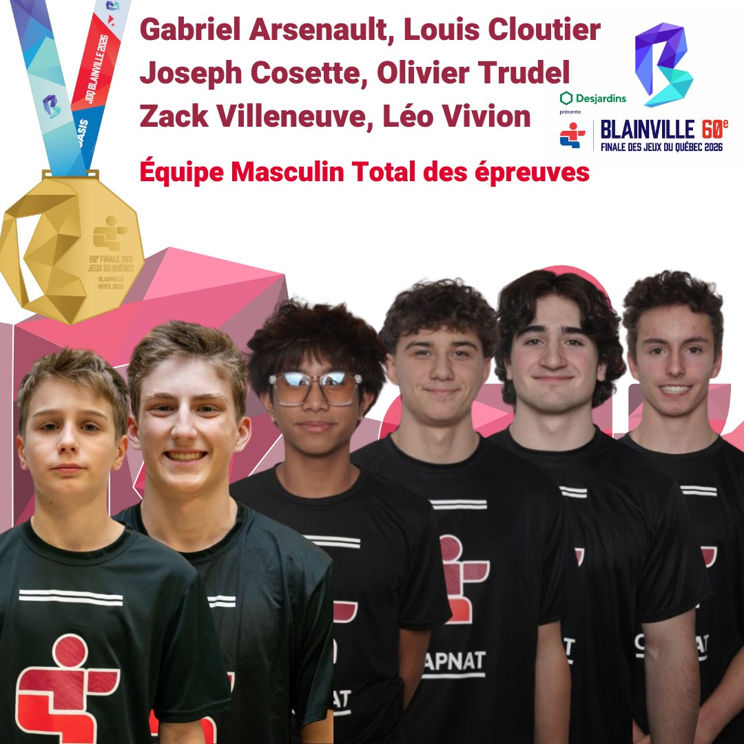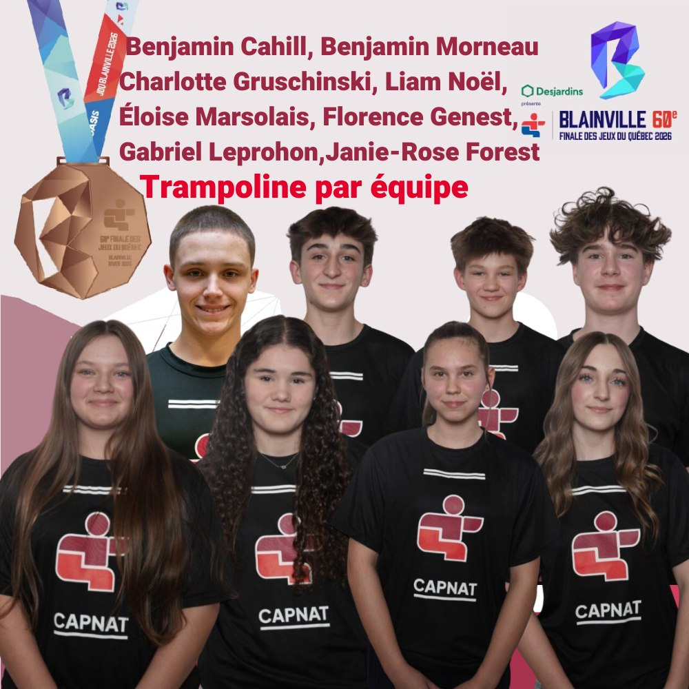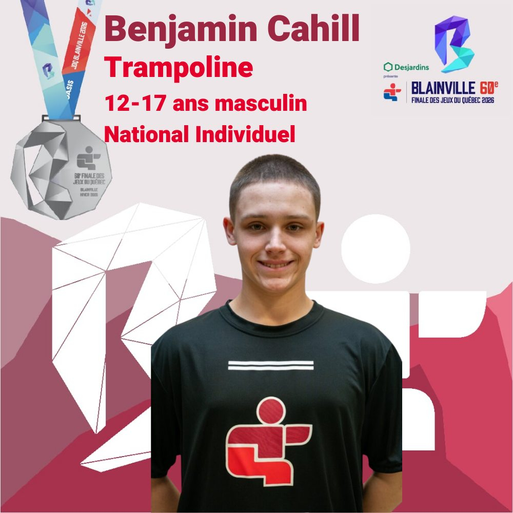 Amplitude, contrôle et détermination ont été au rendez-vous pour le trampoliniste Benjamin Cahill dont la performance lui a permis de mériter une médaille d’argent en solo et une médaille de bronze en équipe avec Benjamin Morneau (Québec), Charlotte Gruschinski (Québec), Liam Noël (Québec), Éloise Marsolais (Québec), Florence Genest (L’Ancienne-Lorette), Gabriel Leprohon (Québec) et Janie-Rose Forest (Lévis).