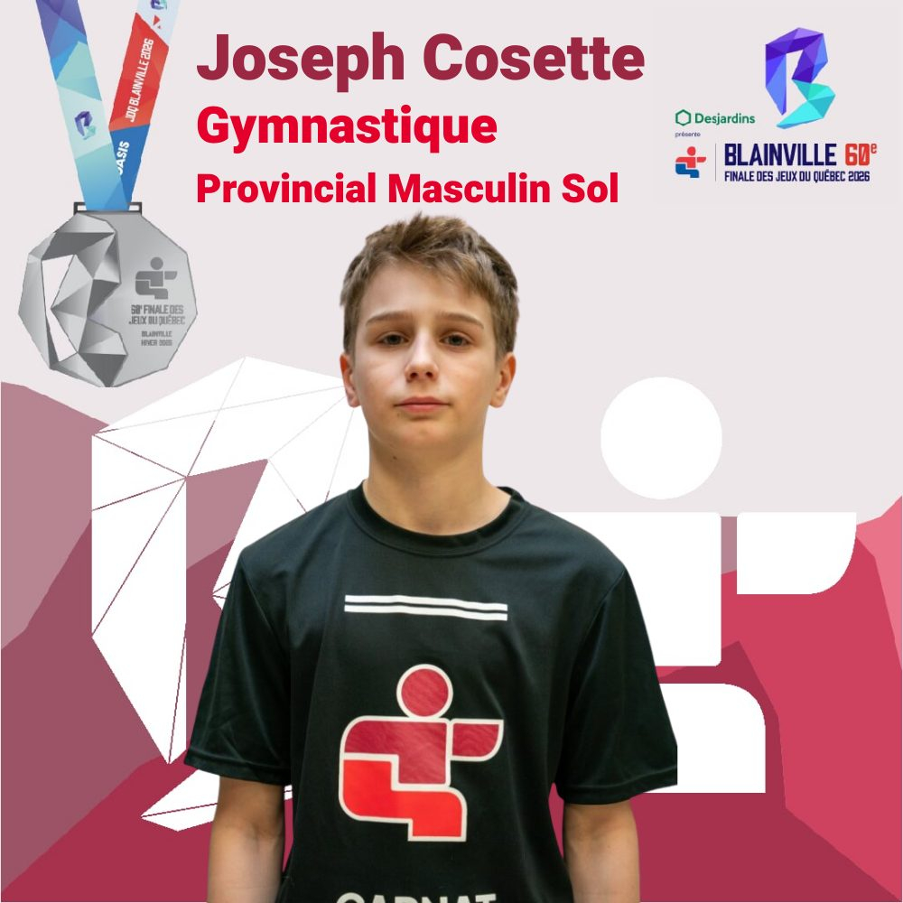Joseph Cossette s’est distingué en gymnastique avec une excellente performance qui lui a permis d’obtenir une médaille d’argent à l'épreuve au sol après une routine exécutée avec précision, ainsi qu’une médaille d’or avec l’équipe masculine qui est montée sur la plus haute marche du podium au total des épreuves.