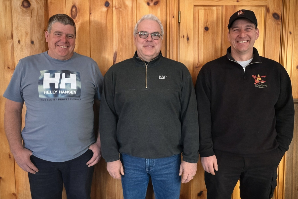 Le trio de bénévoles à l’origine de la relance du Club Le Sapin d’Or, le responsable de la mécanique, Jérôme Blouin, le président, Benoît Cloutier, et le vice-président, Tommy Verreault. (Photo : Gracieuseté, Nathalie Duclos)