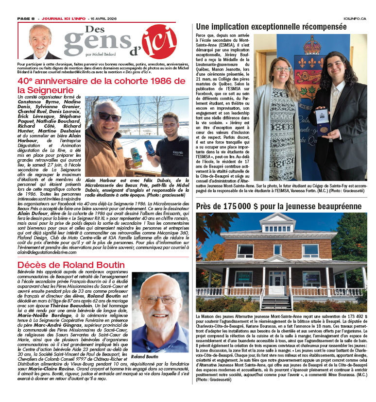 Pour participer à cette chronique, faites parvenir vos bonnes nouvelles, potins, anecdotes, anniversaires, nominations ou faits dignes de mention dans divers domaines accompagnés de photos au soin de Michel Bédard à l’adresse courriel mbedard@icilinfo.ca avec la mention « Des gens d’ici ».