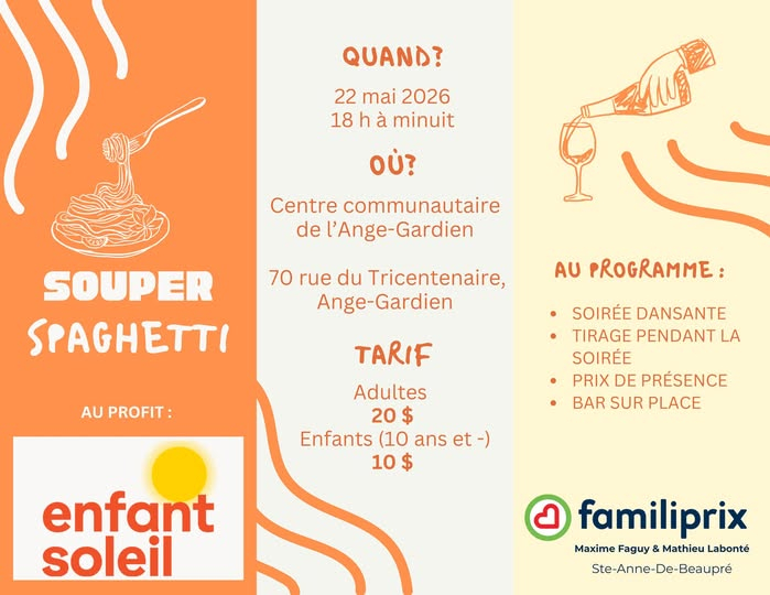 La pharmacie Familiprix Maxime Faguy et Mathieu Labonté de Sainte-Anne-de-Beaupré organise une activité de financement le vendredi 22 mai, de 18 h à 24 h, au Centre communautaire de L'Ange-Gardien.