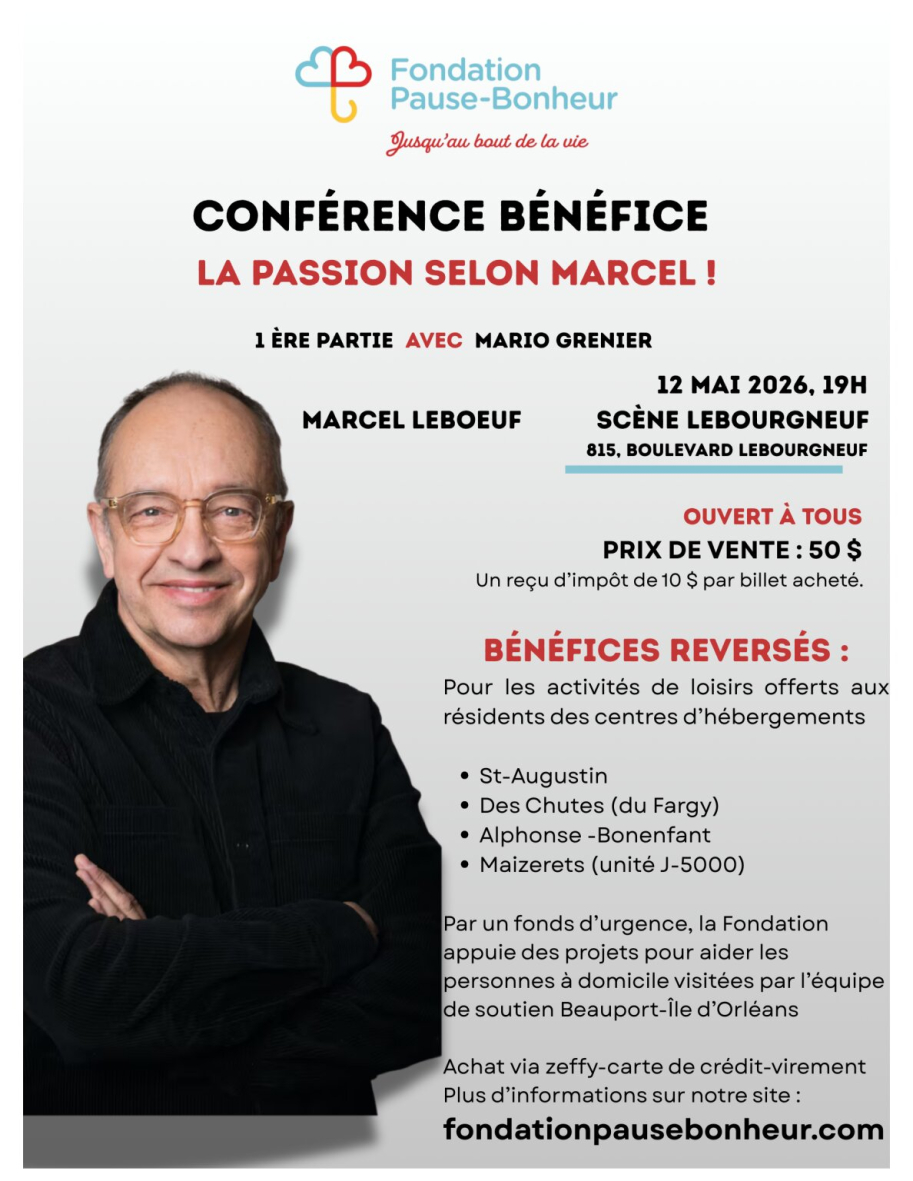 La Fondation Pause-Bonheur vous invite à participer à ce rendez-vous, le mardi 12 mai à 19 h à la Salle LeBourgneuf (815, boul. LeBourgneuf Québec G2J 0C1). Les billets sont au coût de 50 $ et un reçu d'impôt de 10 $ par billet acheté sera émis.